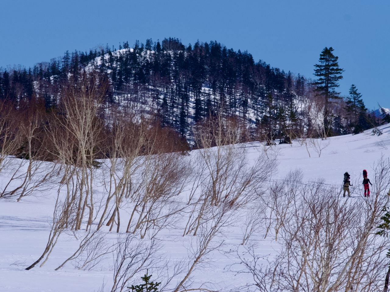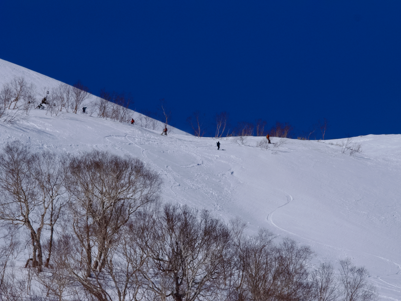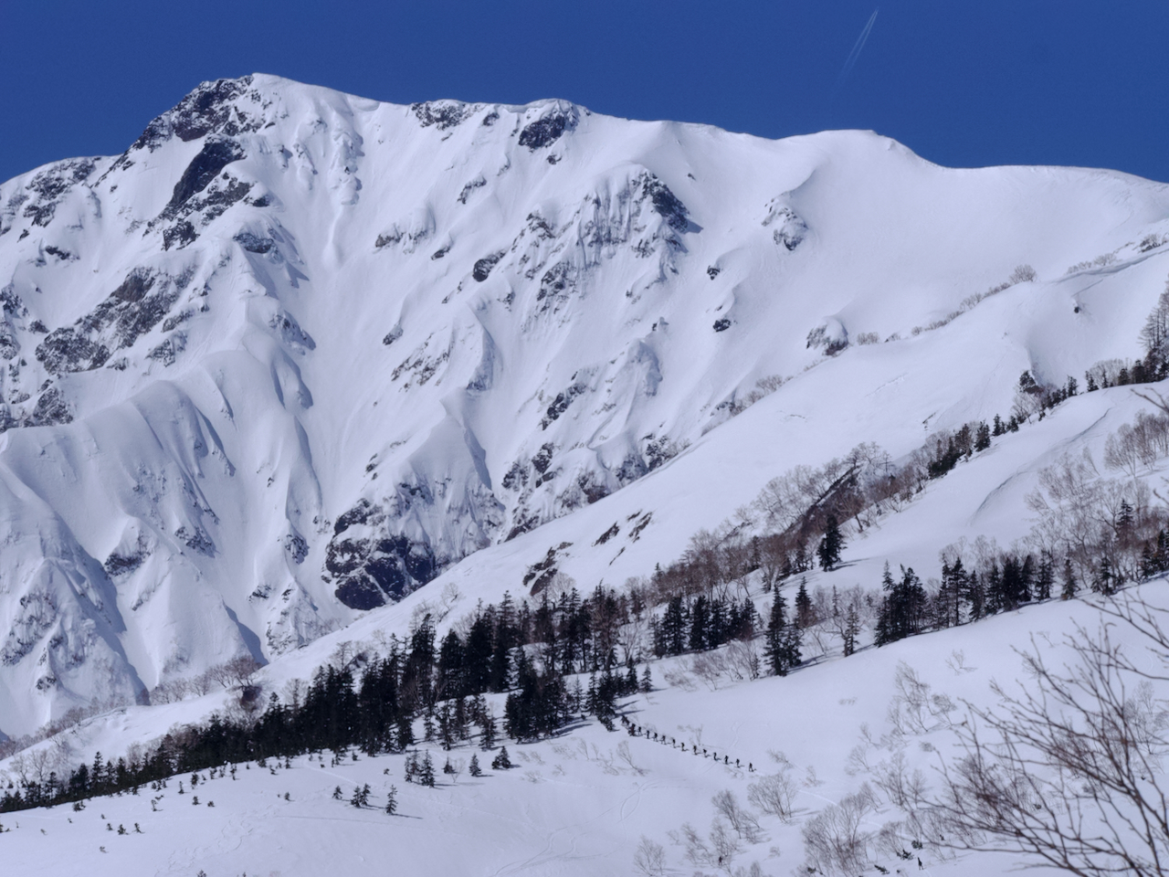 山の斜面を一列になって登っていくバックカントリーの一段。点々と等間隔で見えたので人工物かと目を凝らしたら等間隔で登っている人でした。