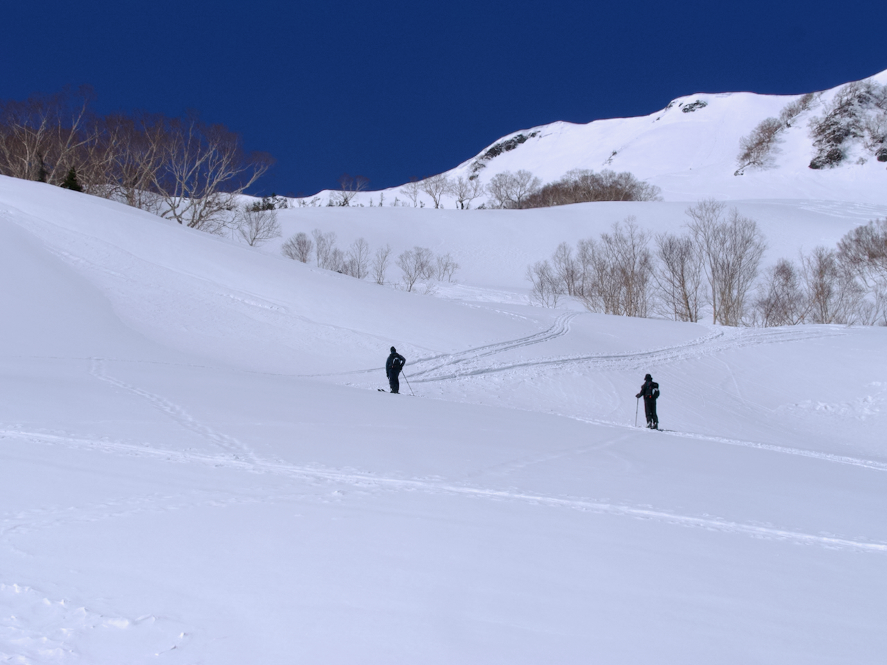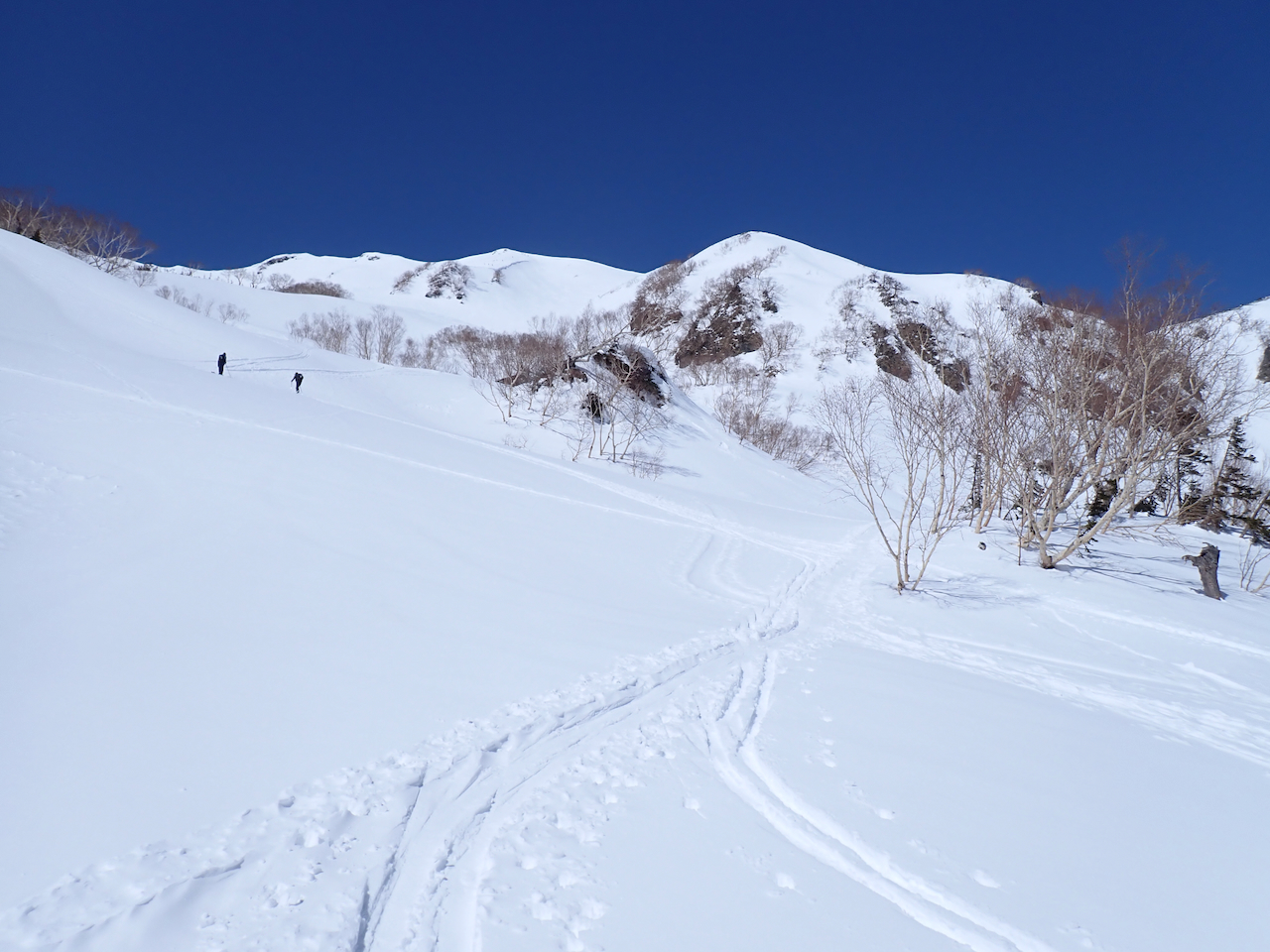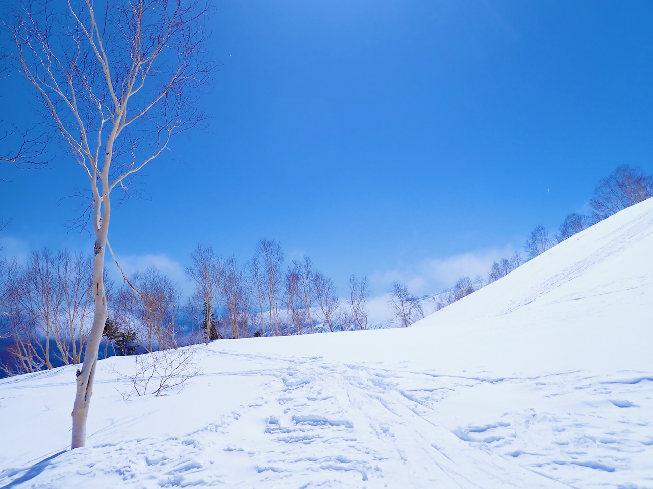山の斜面を一列になって登っていくバックカントリーの一段。点々と等間隔で見えたので人工物かと目を凝らしたら等間隔で登っている人でした。