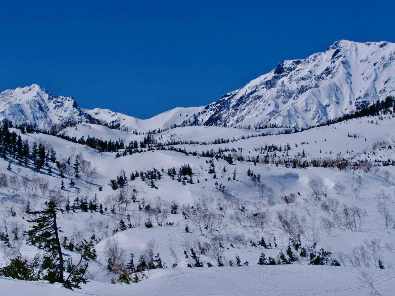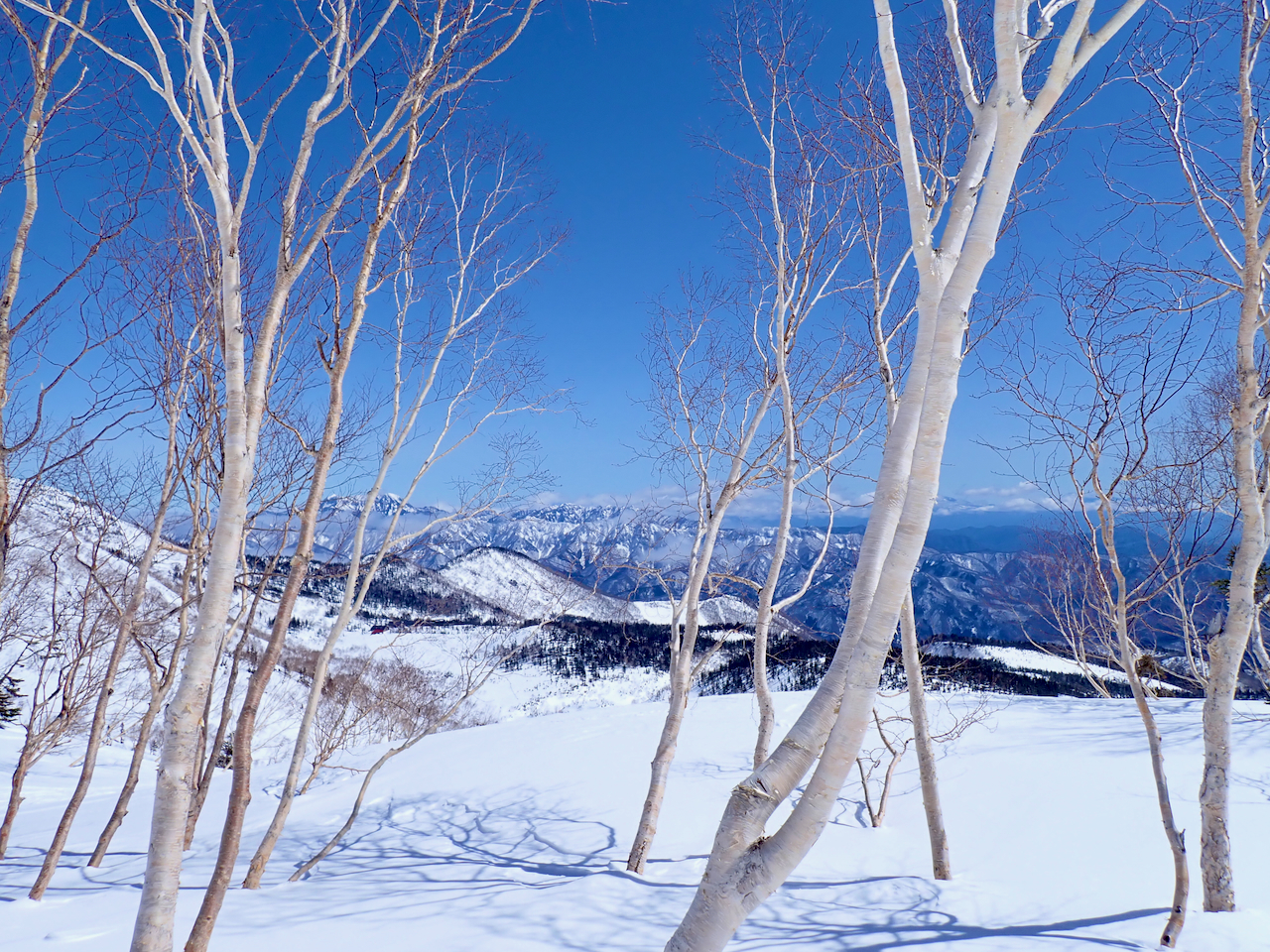 ロープウェイ駅を出て数分でこの絶景です。雪に埋もれた栂池ヒュッテと背後の白馬乗鞍岳。