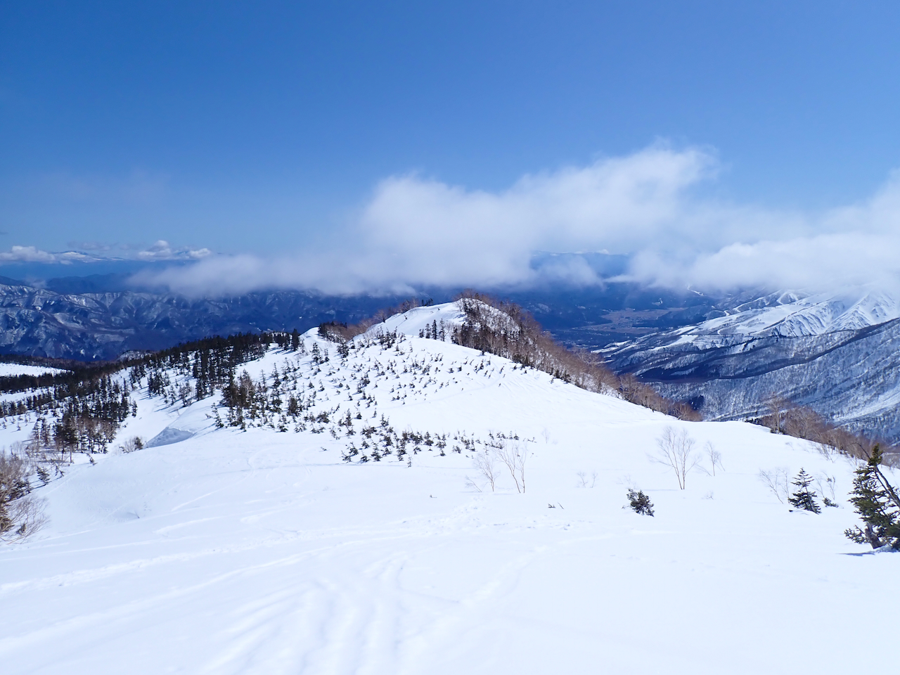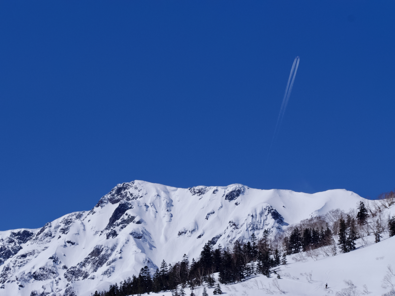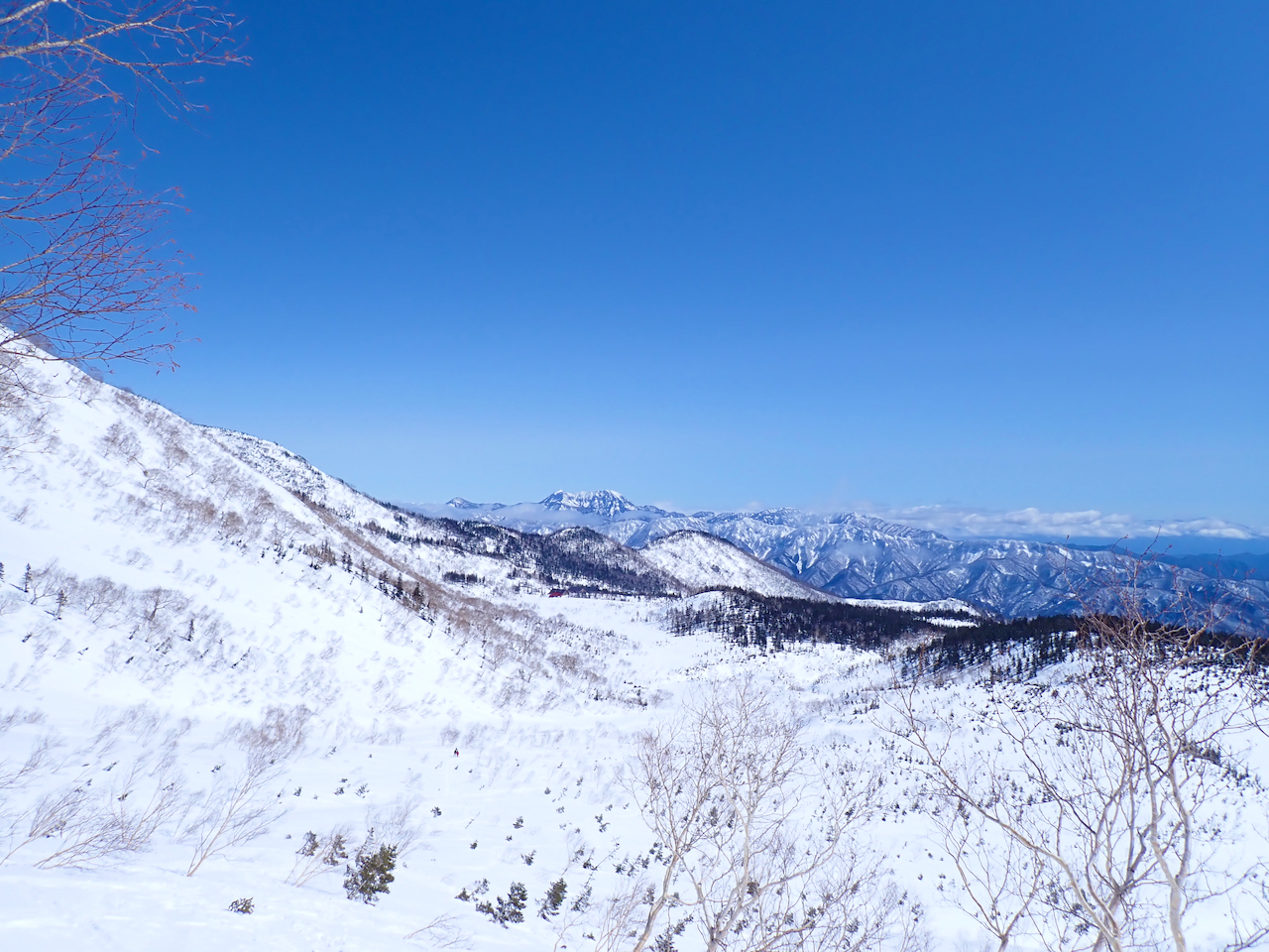 白馬乗鞍から滑走するスキーヤー。