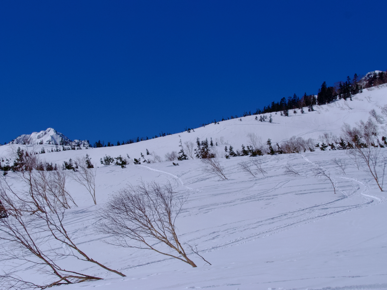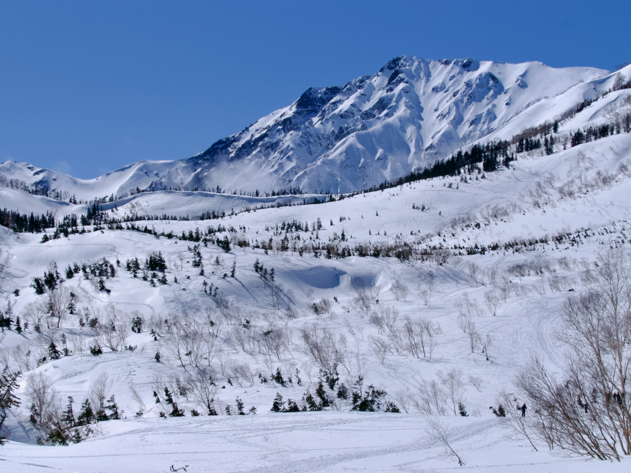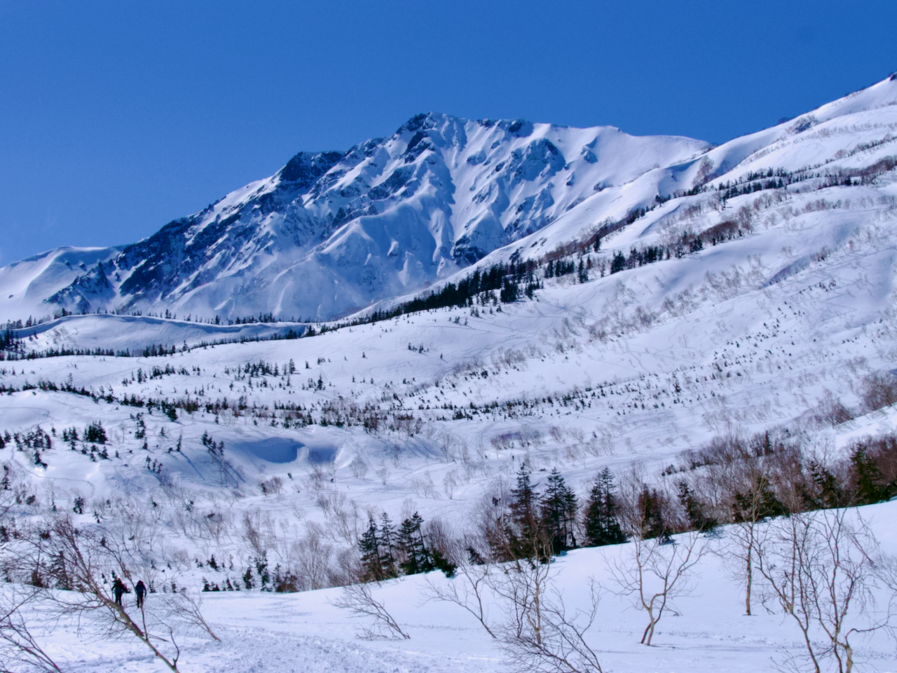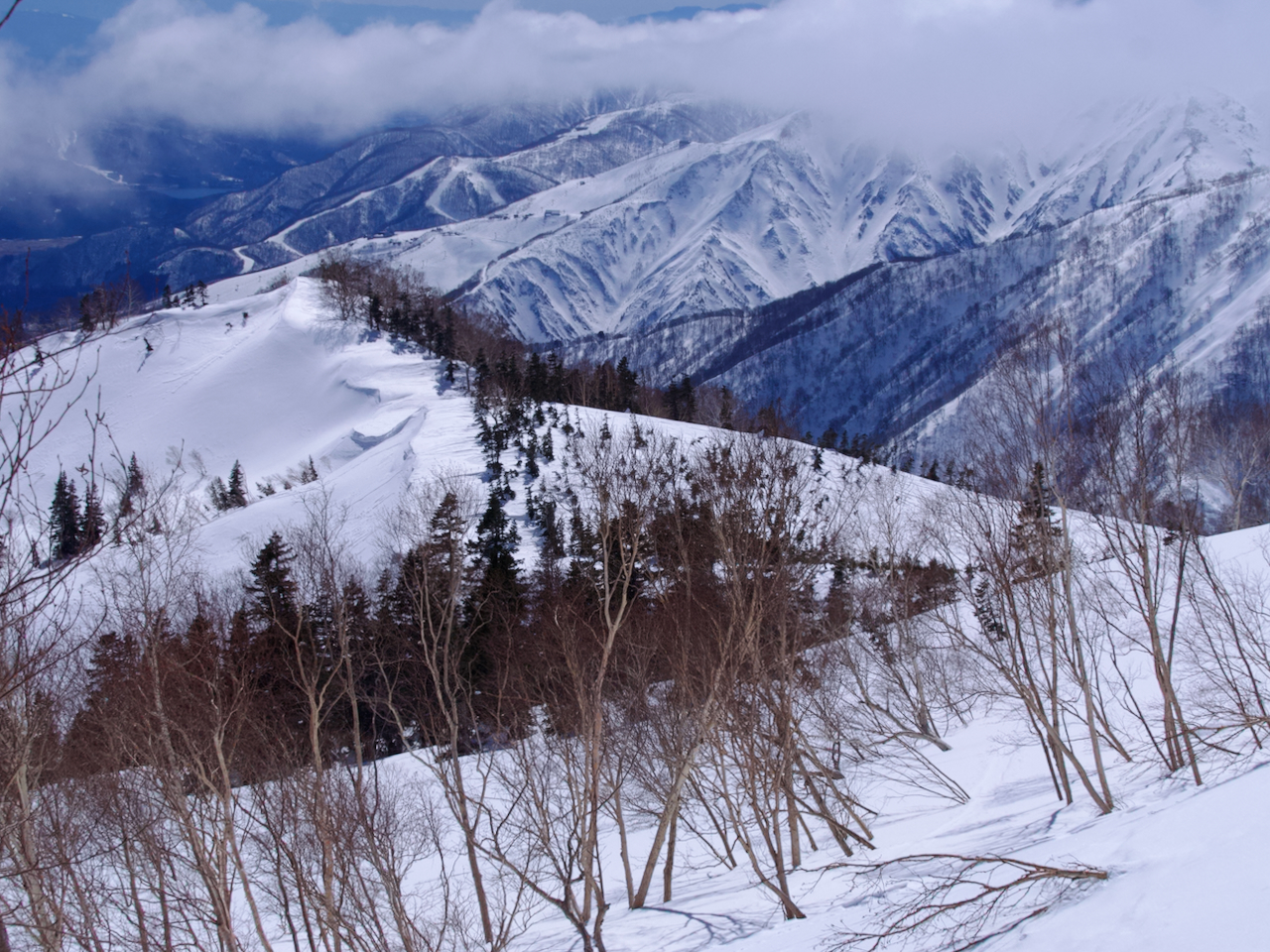 白馬乗鞍から滑走するスキーヤー。