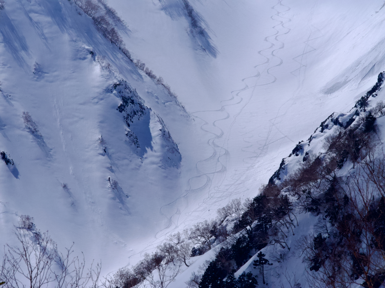 白馬大雪渓に描かれたシュプール。